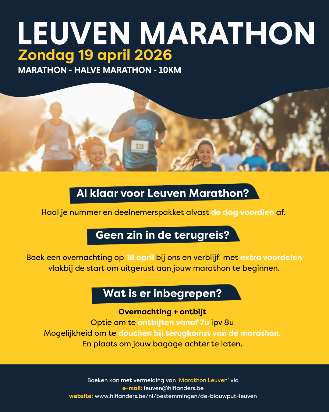 Boeken: vermeld ‘Marathon Leuven’ via e-mail: leuven@hiflanders.be